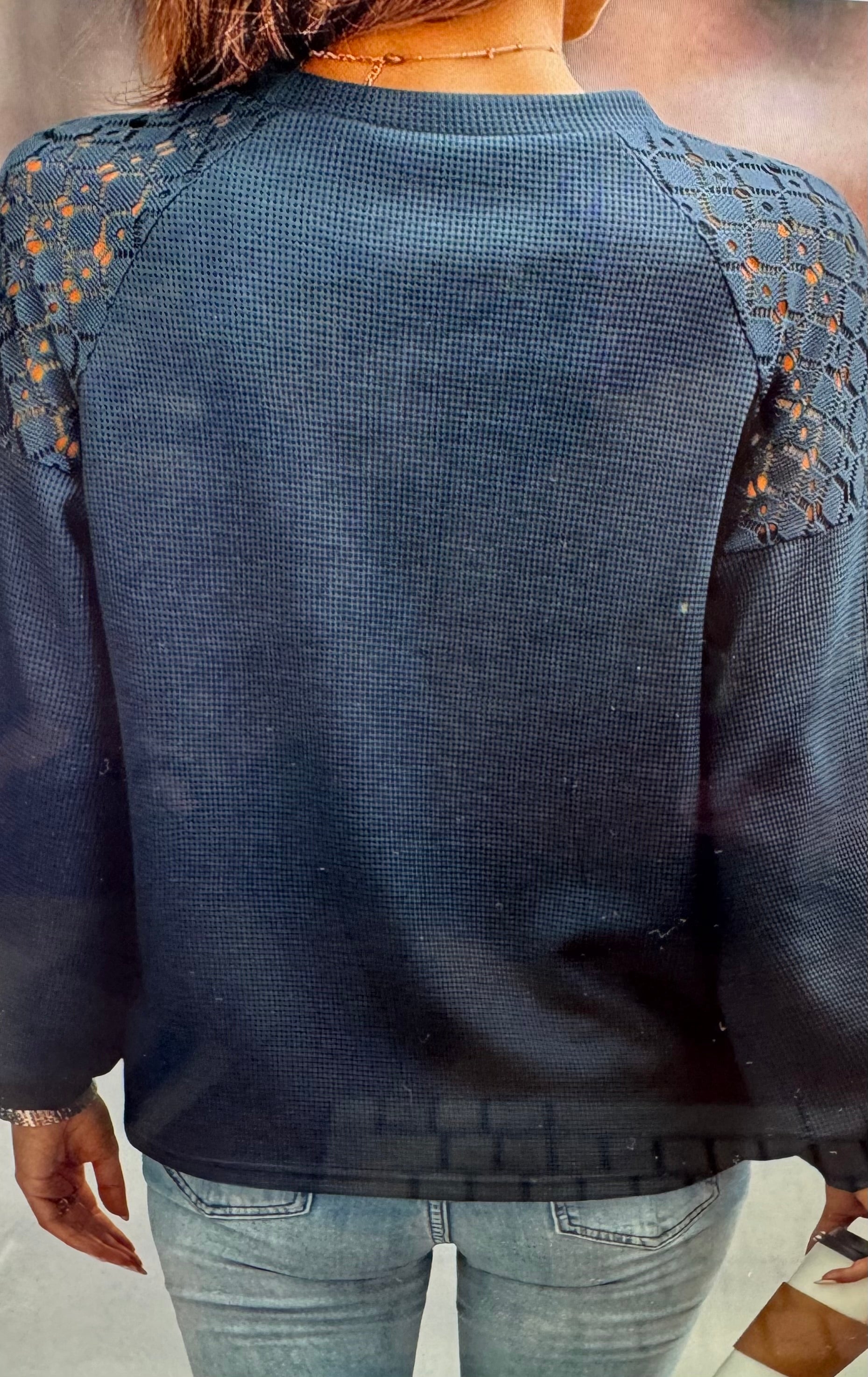 Elevate your wardrobe with this sophisticated Lacy and Black Top a lace patchwork pullover, expertly crafted from a premium blend of 95% polyester and 5% elastane. The textured long sleeves and intricate lace detailing create visual interest while the elastane ensures a comfortable, flexible fit that moves with you. This versatile piece transitions seamlessly from casual to polished occasions. Care is effortless—simply machine wash warm and tumble dry low to maintain its quality and shape season after season.