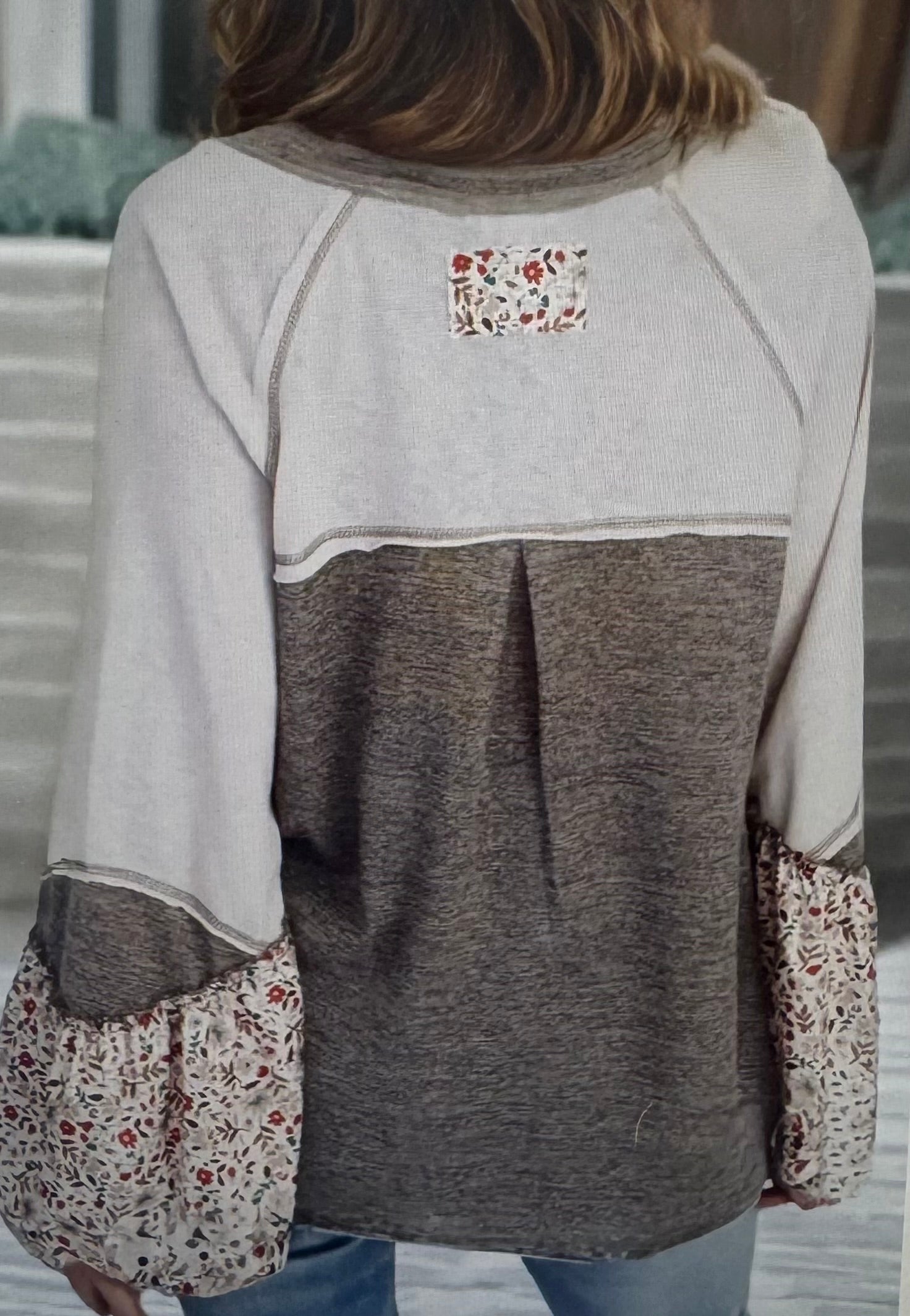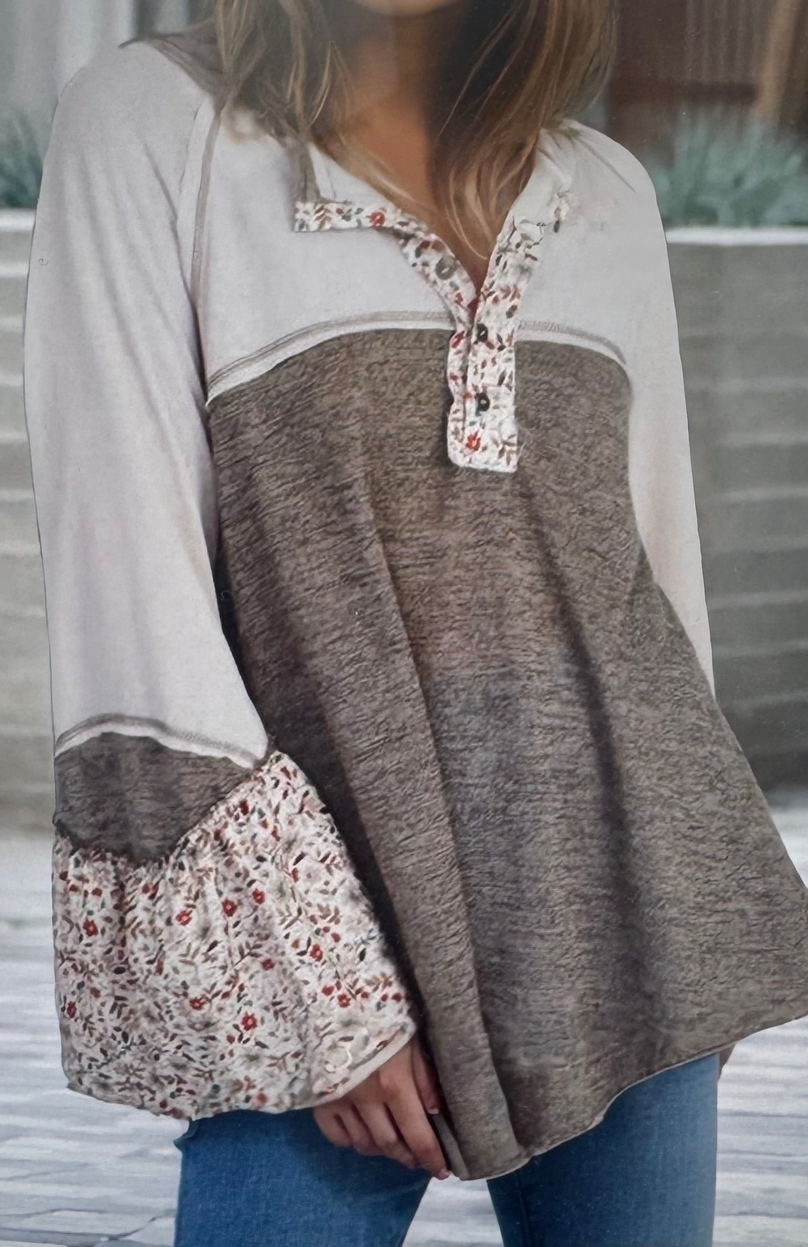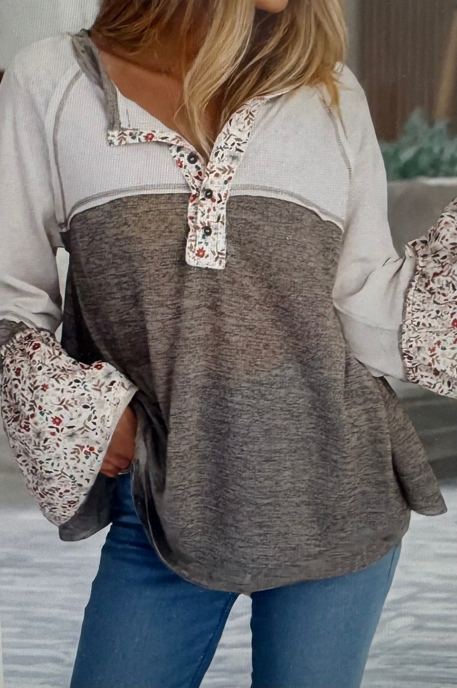 This "Meet Me In The Flower Patch" long sleeve top combines comfort and style with its round neck, color block design, and bell sleeves featuring a contrasting floral pattern. Crafted from a blend of 50% polyester and 50% viscose, it offers a soft, breathable feel while maintaining durability. Easy care instructions include machine wash warm and tumble dry low, making this top both practical and elegant for everyday wear.