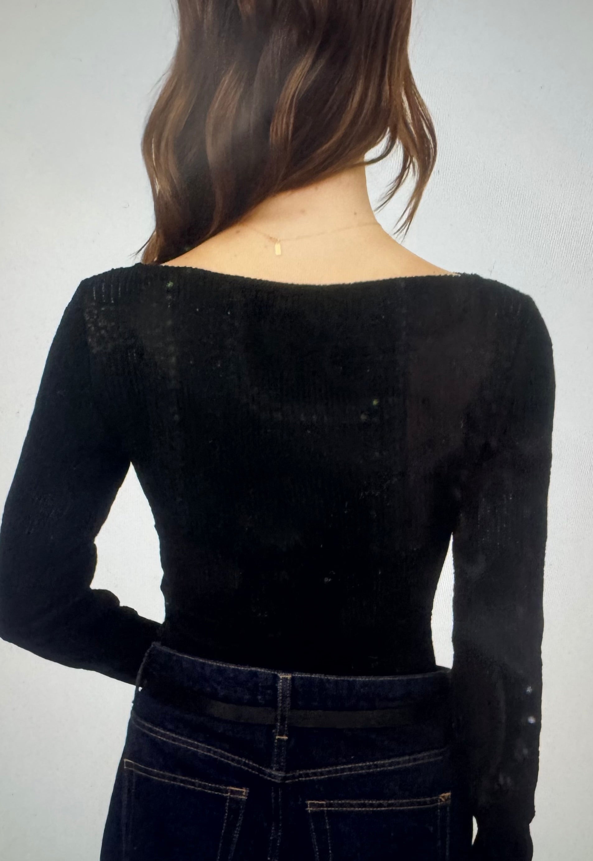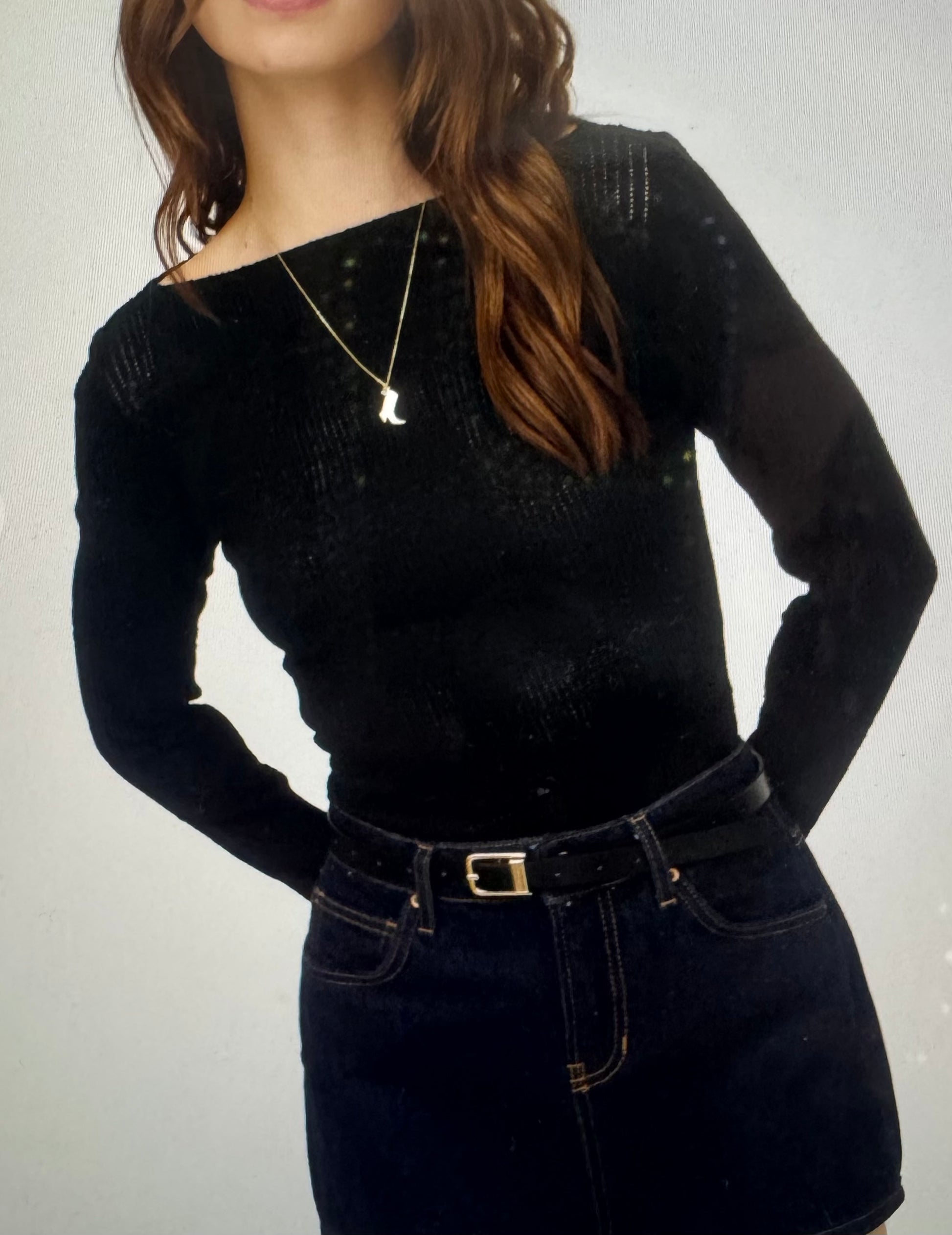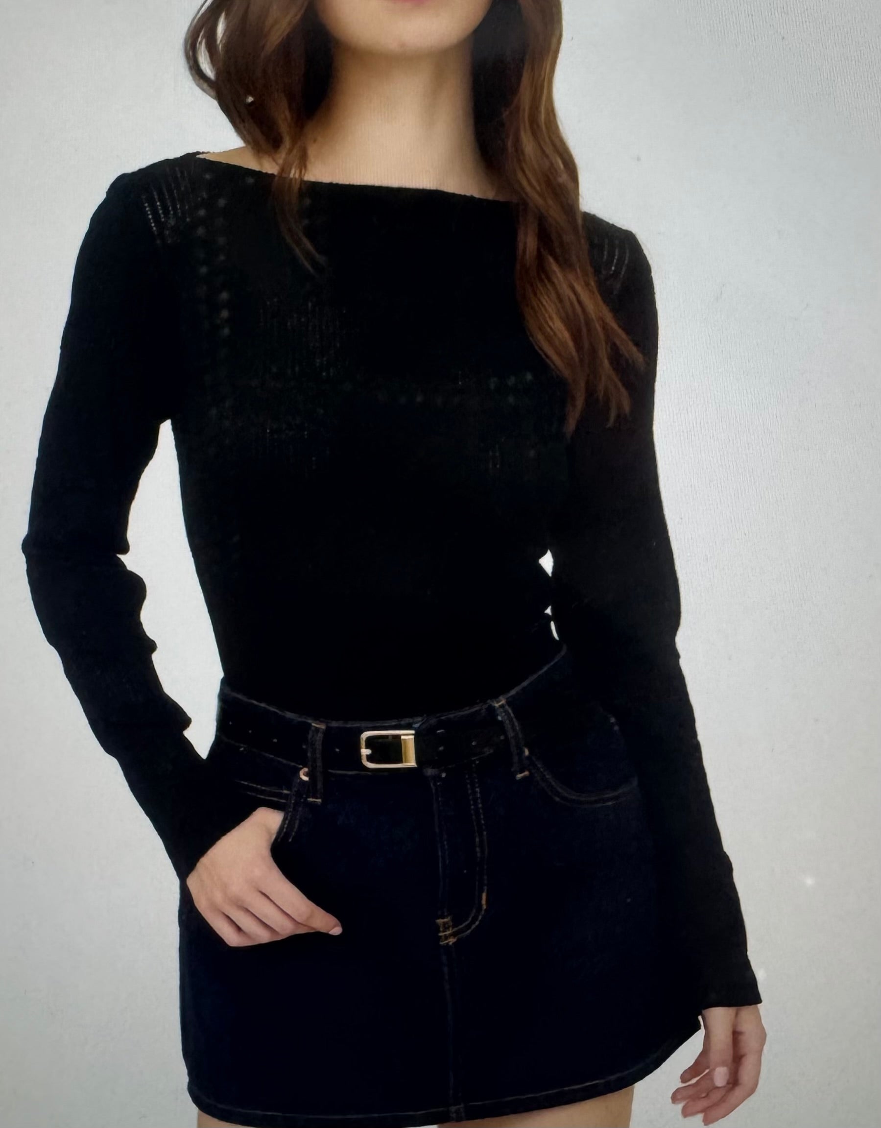 This long-sleeve boat neck top combines elegance with comfort through its delicate crochet knit construction. Crafted from a blend of 55% nylon, 35% cotton, and 10% spandex, it offers both durability and stretch for a flattering fit. To maintain its texture and shape, hand wash inside out and hang to dry. Ideal for layering or as a statement piece, this versatile top is designed for those seeking refined style with expert craftsmanship.