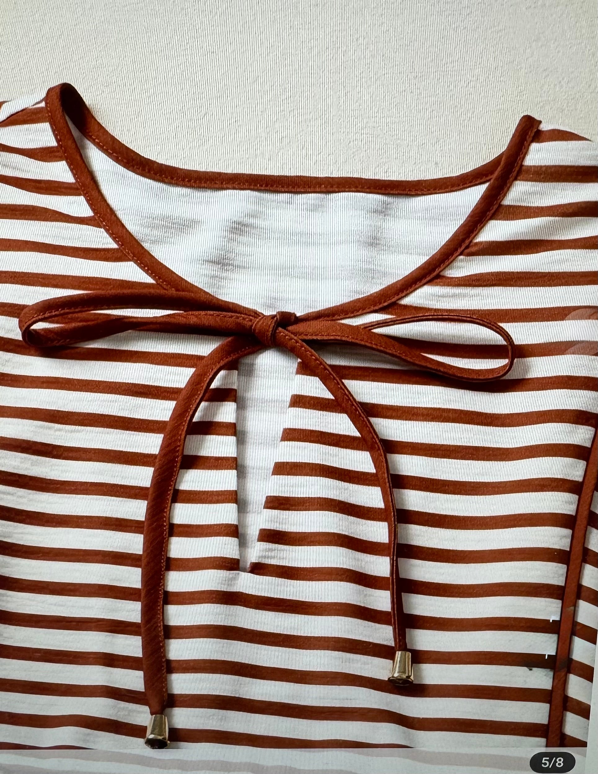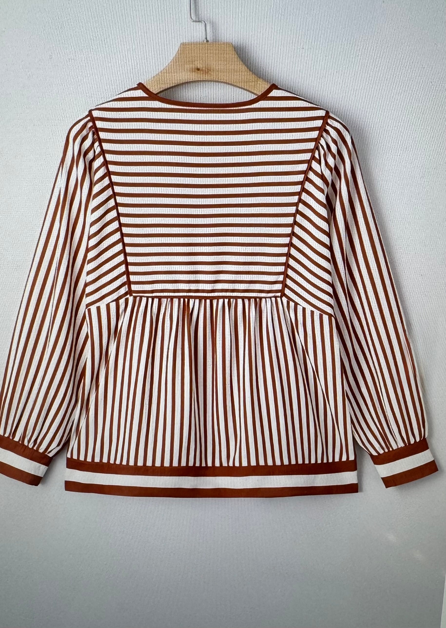 The Movie Night Top features a stylish striped design with a flattering V-neck and convenient drawstring detail. Crafted from 100% polyester, it offers lightweight comfort and easy care—simply machine wash warm and tumble dry low to maintain its shape and vibrancy. This blouse combines effortless style with practicality for your everyday wardrobe.